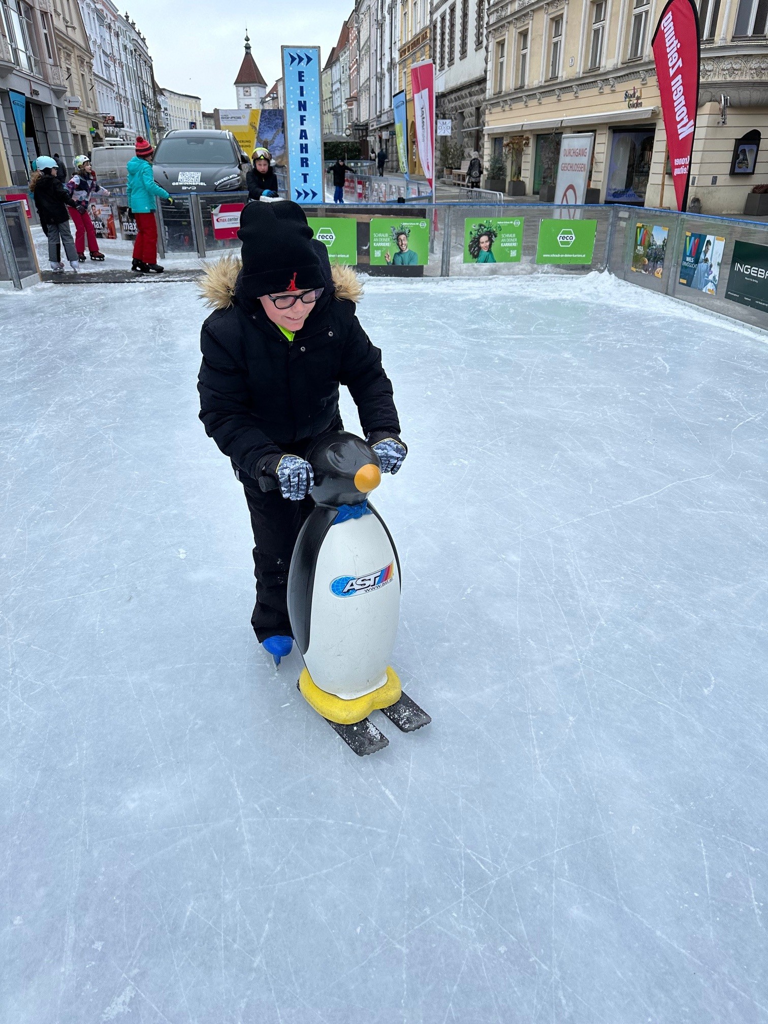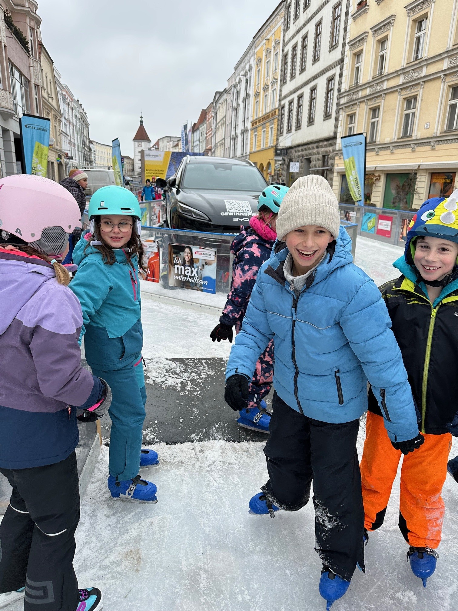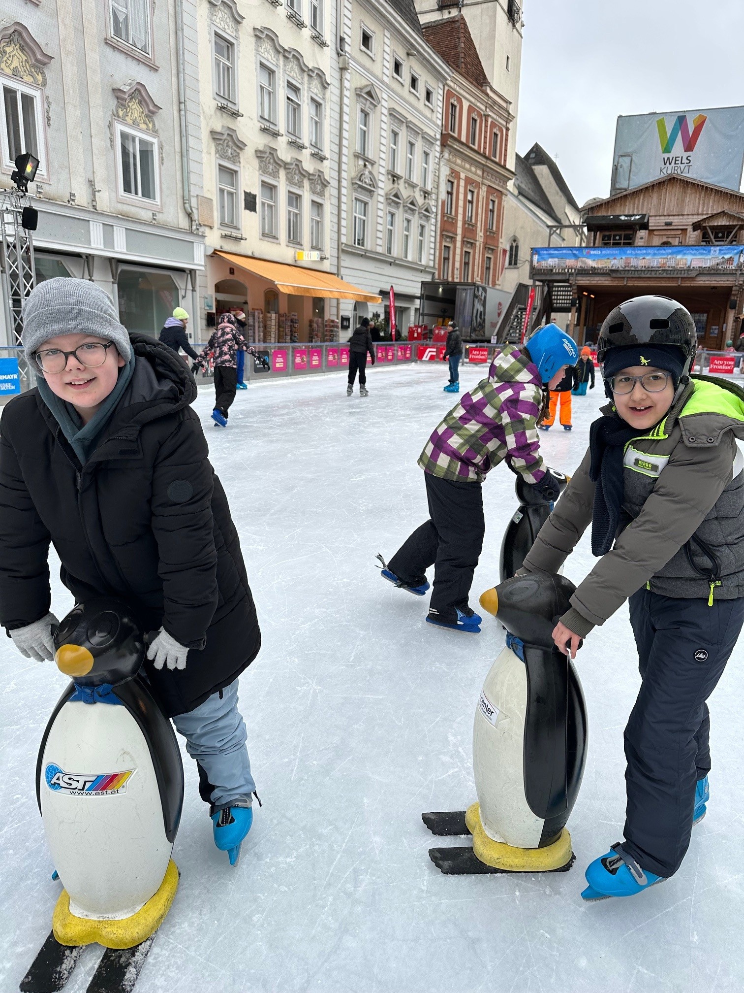 Am Eislauf-Achter angekommen, wurden die Eislaufschuhe ausgeborgt und schon bald drehten alle voller Begeisterung ihre Runden auf dem Eis. Eine Stunde lang wurde gelacht, geübt und gemeinsam das Eislaufen genossen. Für viele war es ein besonderes Erlebnis, über das Eis zu gleiten und die winterliche Atmosphäre mitten in der Stadt zu erleben. Ob erste vorsichtige Runden oder schon schnelle Fahrten – alle hatten sichtlich Spaß und genossen die gemeinsame Zeit.