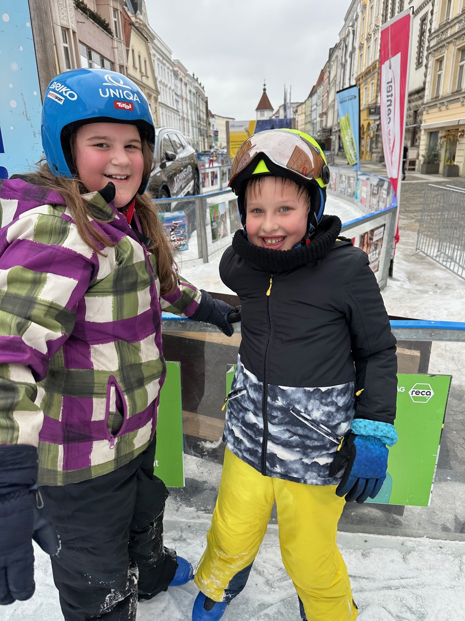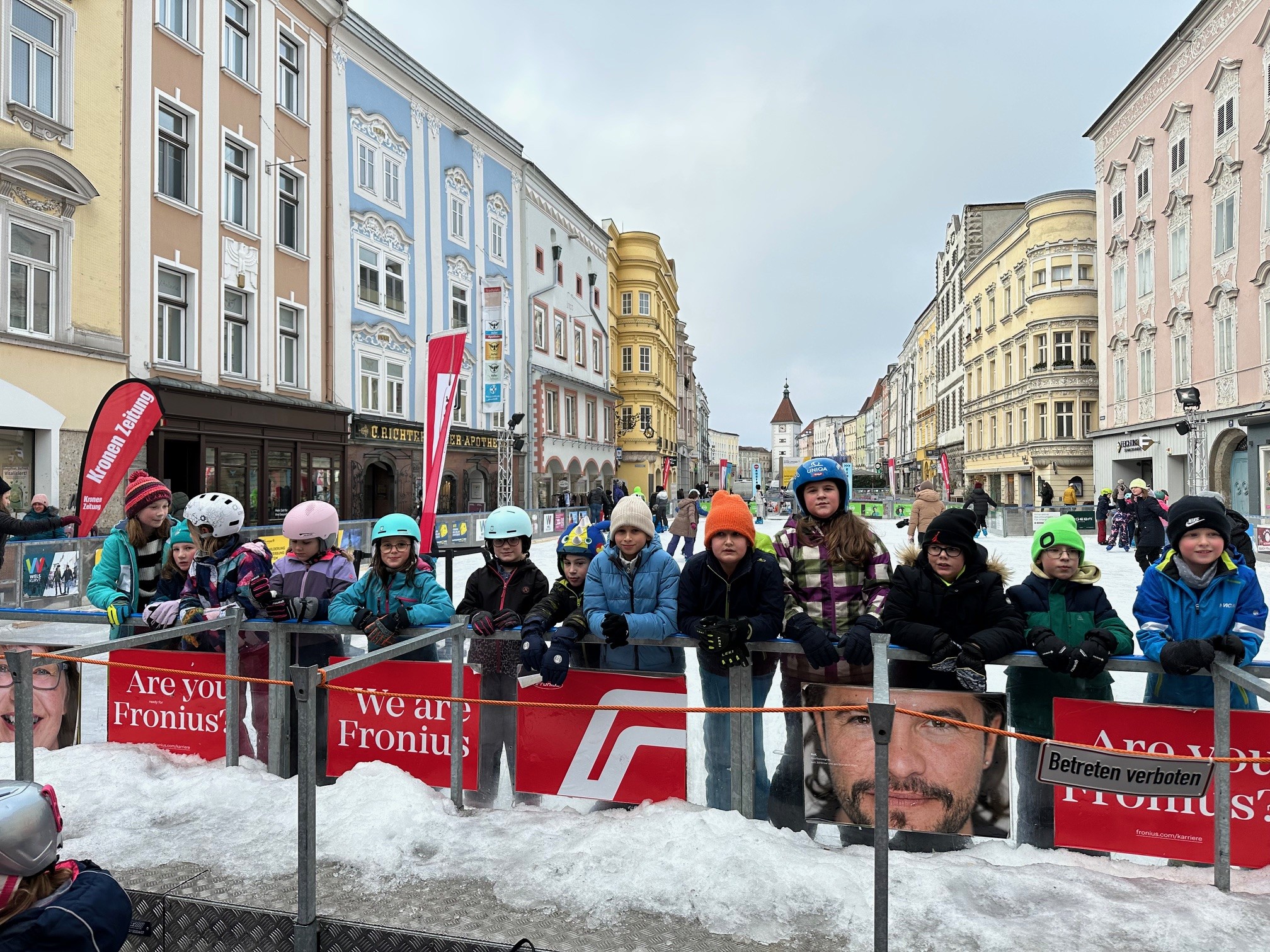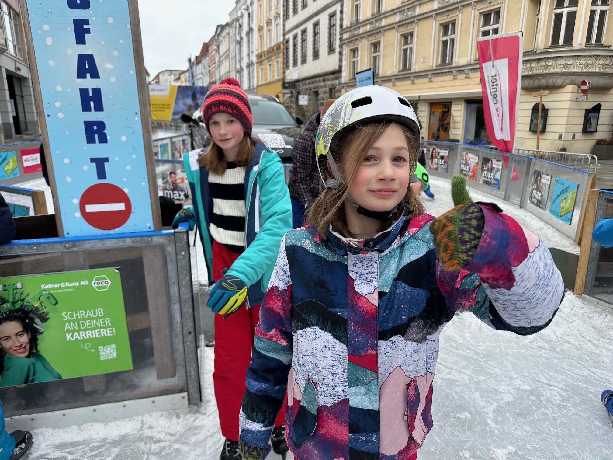 Am Eislauf-Achter angekommen, wurden die Eislaufschuhe ausgeborgt und schon bald drehten alle voller Begeisterung ihre Runden auf dem Eis. Eine Stunde lang wurde gelacht, geübt und gemeinsam das Eislaufen genossen. Für viele war es ein besonderes Erlebnis, über das Eis zu gleiten und die winterliche Atmosphäre mitten in der Stadt zu erleben. Ob erste vorsichtige Runden oder schon schnelle Fahrten – alle hatten sichtlich Spaß und genossen die gemeinsame Zeit.